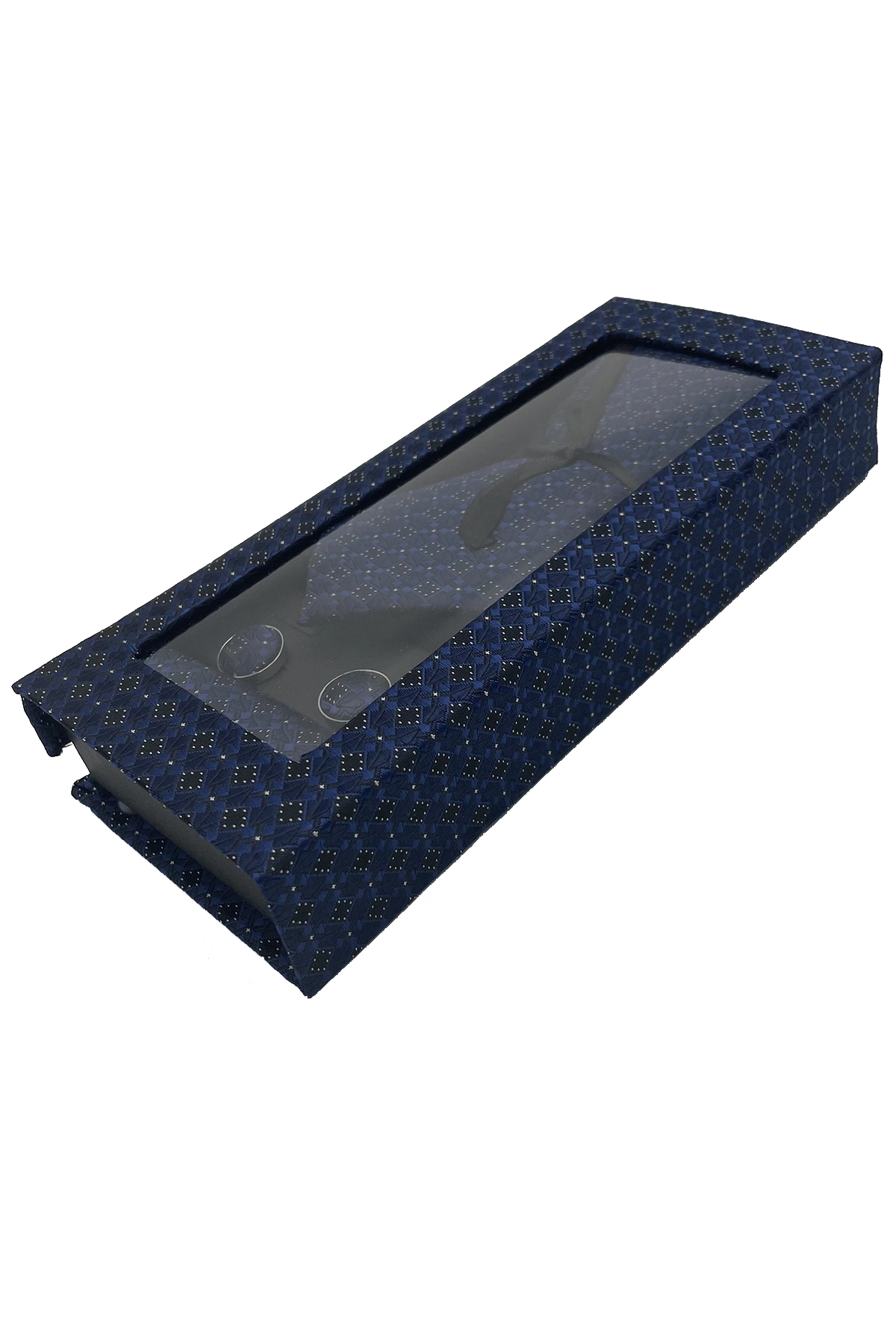 Set de regalo de 3 piezas que incluye corbata, pañuelo y gemelos, todos con un elegante diseño geométrico en tono azul a juego. Ideal para ocasiones formales y como detalle especial