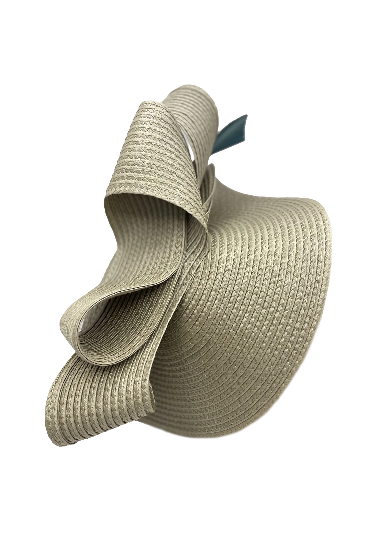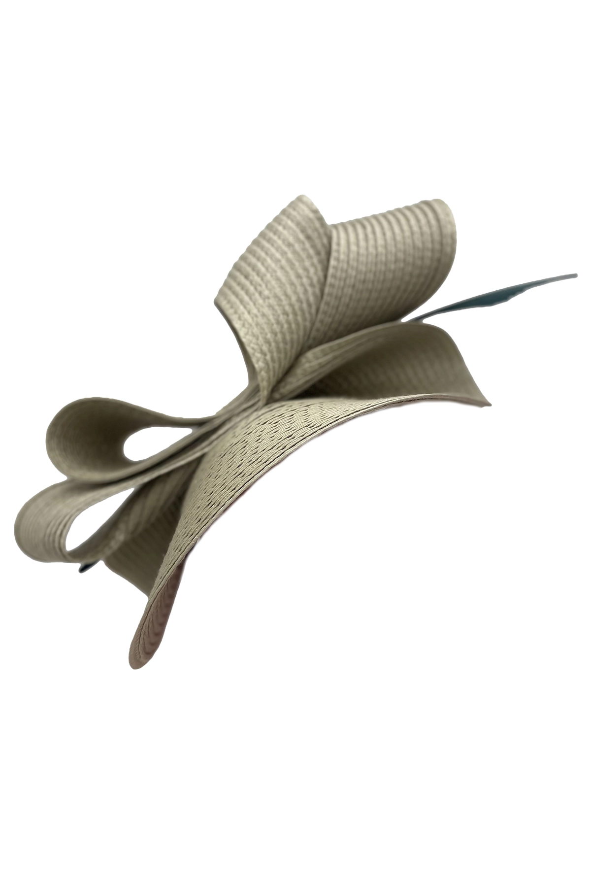 Este sofisticado tocado en color blanco destaca por su diseño escultórico elaborado con finas ondas textiles que aportan volumen, movimiento y un toque moderno. Realzado con delicadas plumas en tono verde oscuro, combina armoniosamente la suavidad de las formas con un detalle natural que añade altura y distinción.